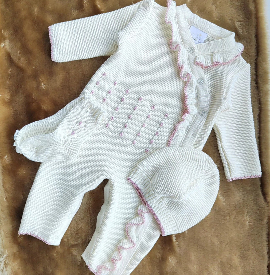 panty con tirantes y buzo clemencia tejido para bebe rosado/blanco