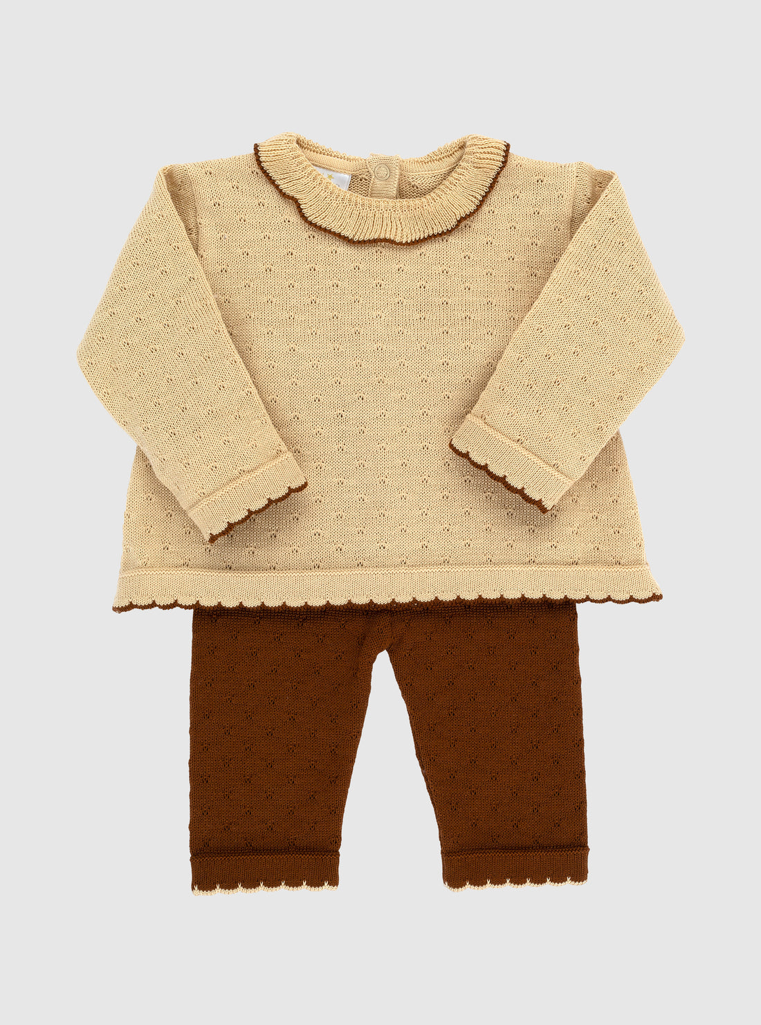 El conjunto de algodón presenta un buzo y un chicle con cuello de bolero. Ideal...