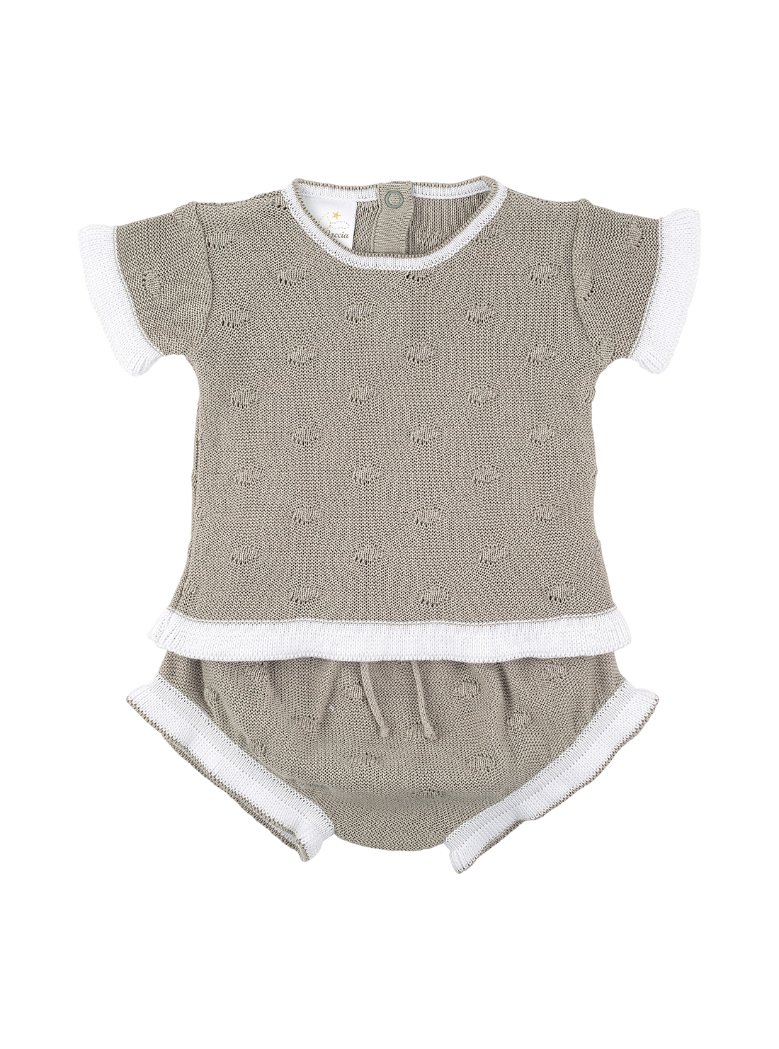 El conjunto de algodón presenta un buzo y un chicle con cuello de bolero. Ideal...