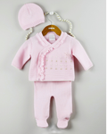 Dale un toque de sofisticación rococó a tu pequeña con este exquisito conjunto. El saco cruzado luce una encantadora gola que enmarca el cuello y se extiende por el cruce frontal, creando un efecto elegante y refinado. Pequeños bordados rococó aparecen dispersos en el pecho, añadiendo un detalle artesanal y único. El cierre se realiza con broches seguros a lo largo de la apertura cruzada, facilitando el vestir. Acompaña el look un pantalón con pie integrado, confeccionado en el mismo tejido suave y el pie cerrado mantiene sus piececitos abrigados. ¡Un conjunto que transformará a tu bebé en una pequeña dama!