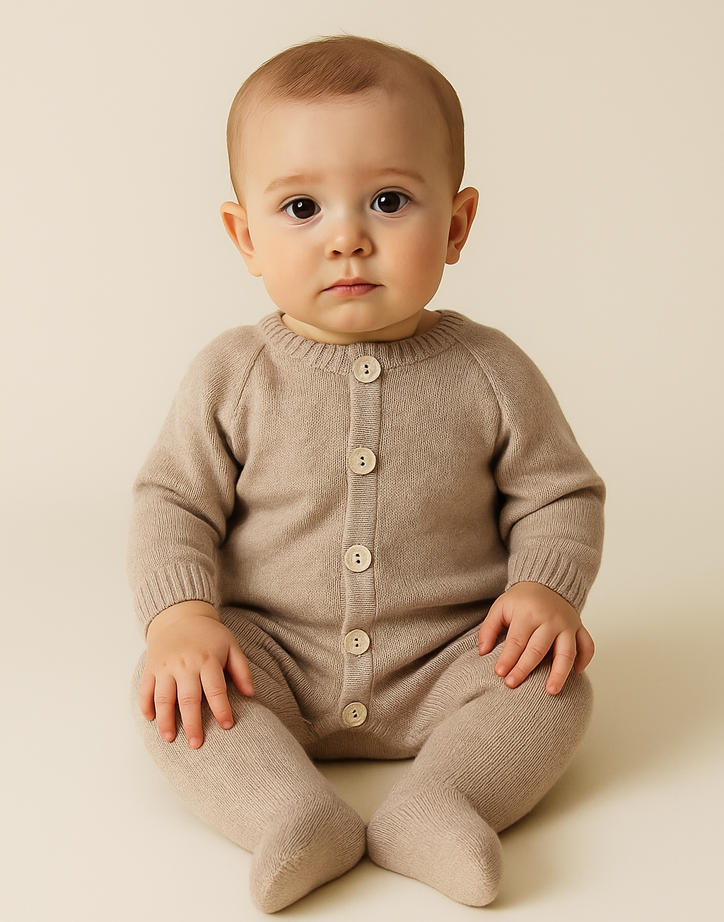 Este mameluco está confeccionado en una mezcla de alpaca y algodón, con un diseño que se abre completamente por delante. Ofrece una combinación de calidez, suavidad y funcionalidad para tu bebé.