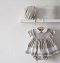 Este exquisito vestido con panty combina lo mejor de la tradición y la innovación, confeccionado en un tejido único que mezcla la suavidad del algodón con las ventajas de materiales modernos, ofreciendo una textura ligera con una caída perfecta. Su diseño en gris perla y blanco crea un look atemporal y sofisticado, mientras el delicado cuello bebé bordado añade un toque de artesanía y distinción. La holgada silueta y mangas cómodas aseguran libertad de movimiento, ideal para eventos especiales o uso diario. Perfecto para bautizos, sesiones fotográficas o celebraciones, este vestido es además un regalo memorable que crecerá en valor sentimental. Combínalo patucos tejidos para completar un outfit de ensueño.