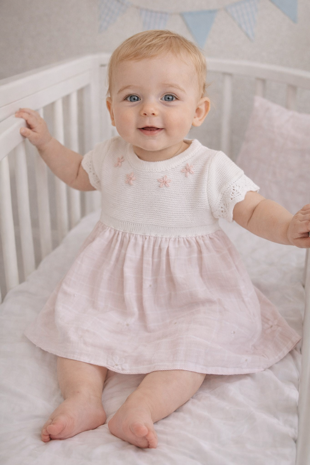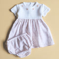 Este encantador Vestido flores y rayas está confeccionado en un suave algodón con un diseño original y con un delicado bordado de margaritas . Combina tejido y tela para ofrecer comodidad y estilo, perfecto para que tu bebé luzca adorable en cualquier ocasión. A conjunto va con su panty.